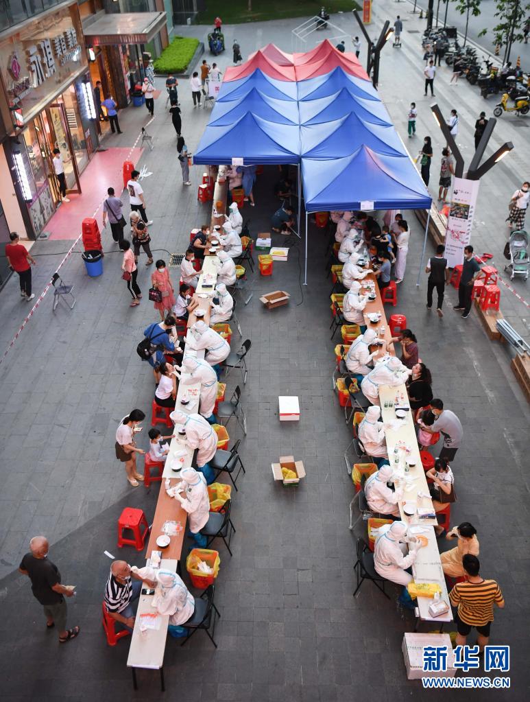 5月27日,在廣州荔灣區廣鋼新城核酸臨時采集點,南方醫科大學南方醫院的醫務人員進行核酸檢測采樣。新華社記者 鄧華 攝