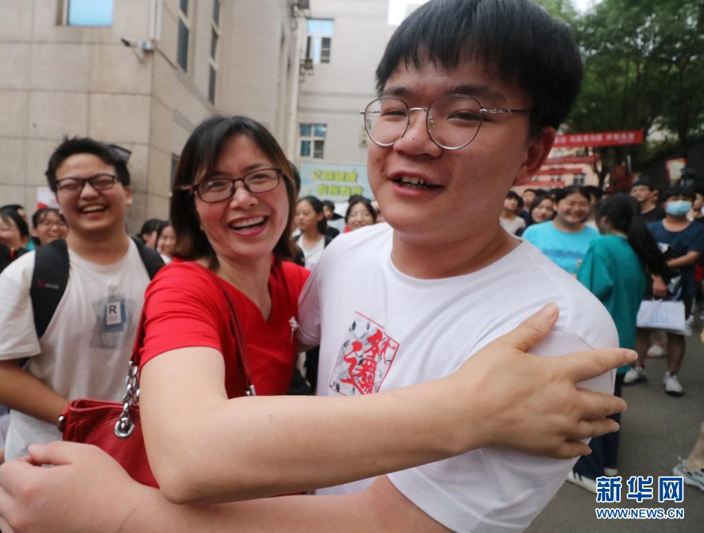6月9日,在湖南省婁底市第二中學考點,走出考場的老三李慶民和班主任舒老師擁抱。