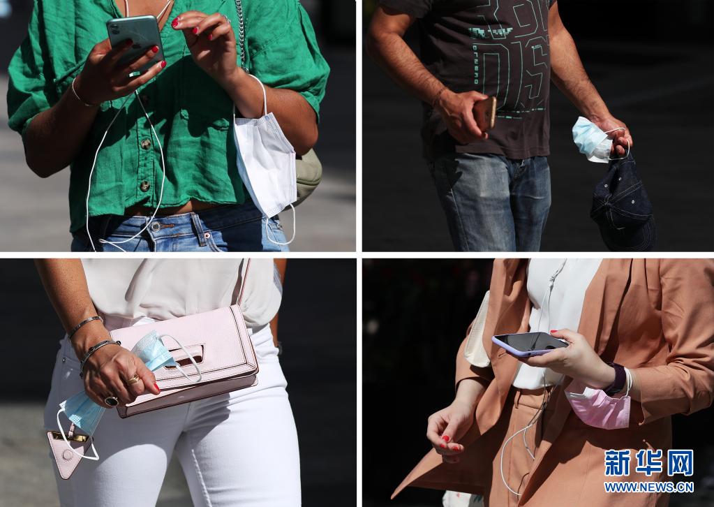這張拼版照片顯示,6月17日,人們拿著口罩走在法國(guó)巴黎香榭麗舍大街上。