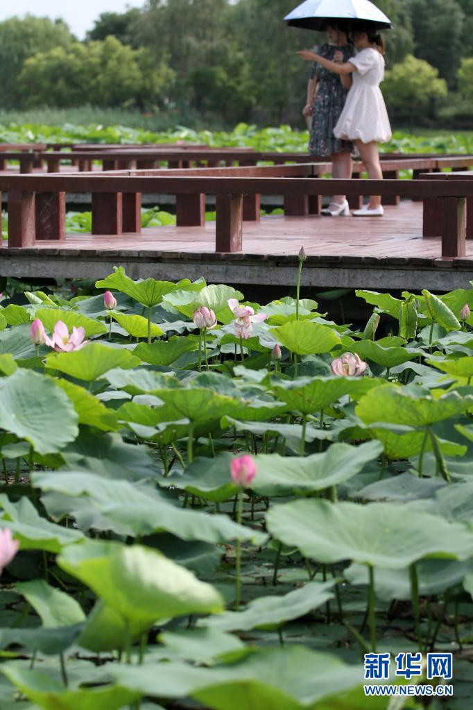 6月21日,在山東省濱州市博興縣麻大湖國家濕地公園百畝荷塘,游客在觀賞荷花。