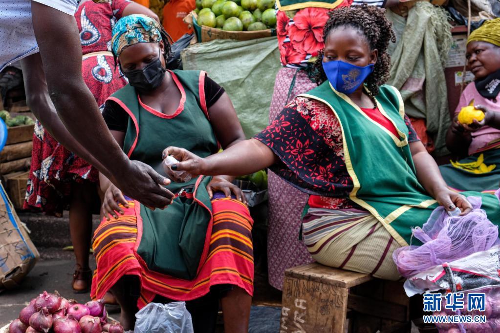 6月23日,商販在烏干達(dá)坎帕拉的納卡塞羅市場給顧客噴灑手部消毒液。