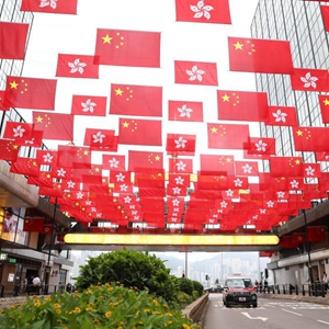 6月29日,在香港尖沙咀一條街上,中華人民共和國國旗和香港特別行政區區旗一起迎風飄揚。