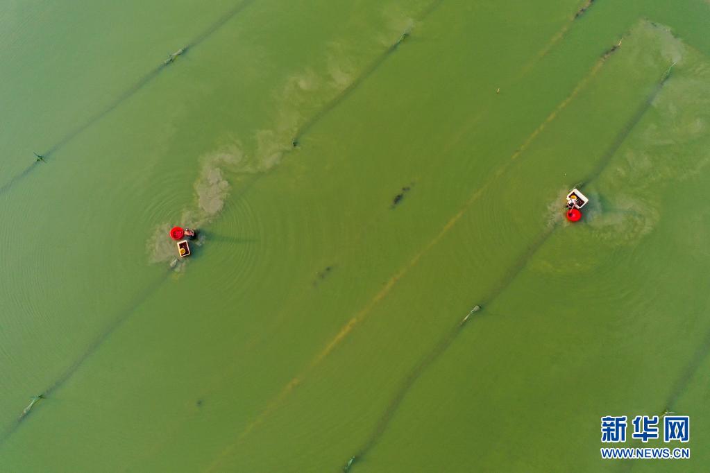 7月5日,在湖南省永州市道縣蚣壩鎮洲背村,村民在收獲小龍蝦(無人機照片)。