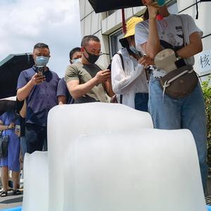 7月22日,在南京市第一醫(yī)院河西院區(qū)核酸檢測(cè)點(diǎn),等待核酸檢測(cè)的隊(duì)伍旁擺上了大冰塊。