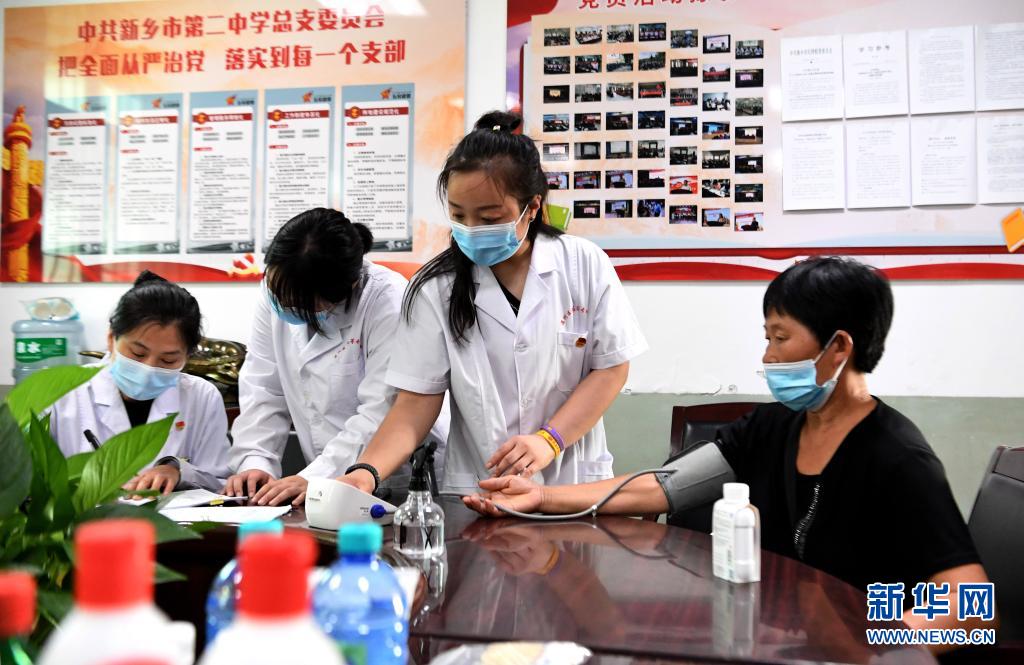 7月25日,醫護人員在河南省新鄉市第二中學臨時醫療救助點為轉移村民測量血壓。