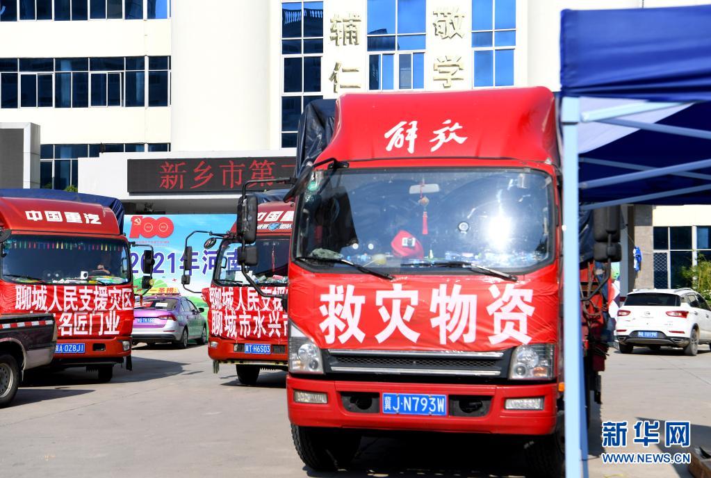 這是7月25日在河南省新鄉(xiāng)市第二中學安置點拍攝的物資運輸車輛。