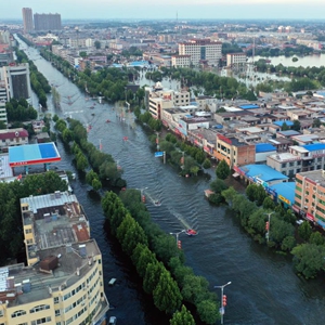 7月26日,在河南省衛輝市,救援船只穿梭于城區內(無人機照片)。