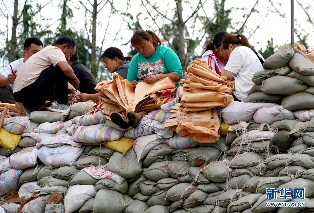 當日,在河南省鶴壁市??h傅莊堤上,不少群眾自發前來和救援人員一起裝沙袋、運沙袋,共筑堤壩。受持續強降雨影響,??h防汛形勢嚴峻,傅莊堤主要為??h縣城及26個村莊提供保護。新華社記者 李安 攝