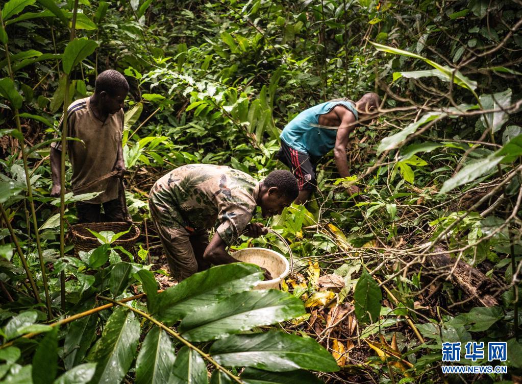 7月18日清晨,中非共和國洛巴耶省當地的俾格米人在森林里找蟲子。