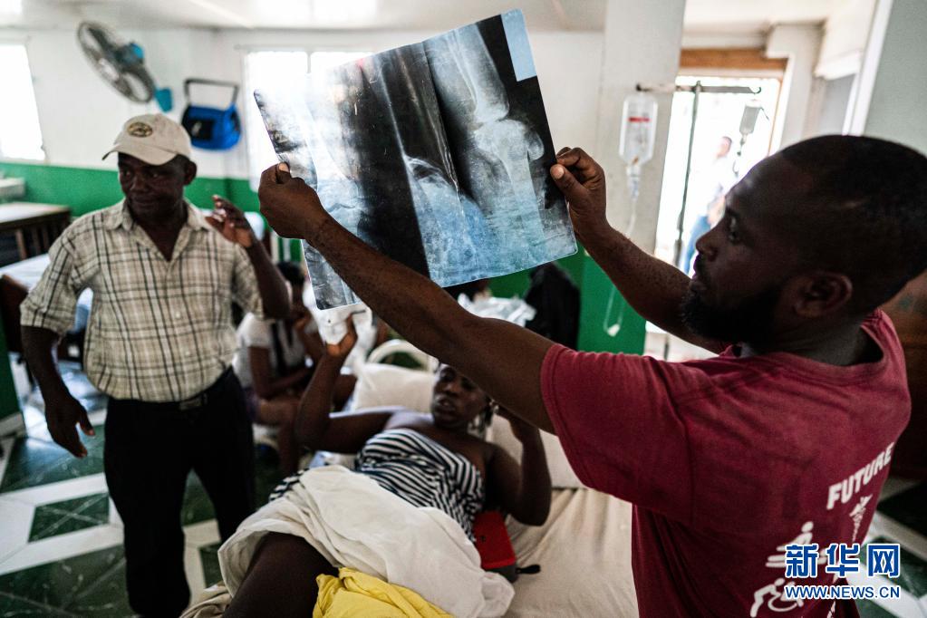 8月18日,一名男子在海地震中附近的萊凱的一家醫院展示X光片。