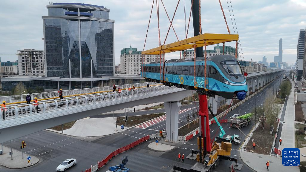 10月19日,在哈萨克斯坦阿斯塔纳,轻轨列车被吊装到轨道上(无人机照片)。