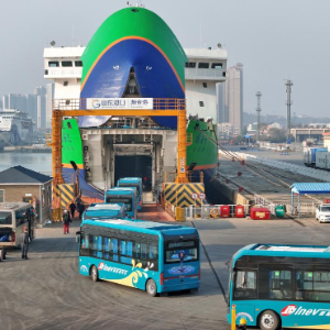 11月30日,一批全新的纯电动公交车在山东港口烟台港登上新能源汽车运输船“绿安达”轮,跨越渤海海峡前往辽宁大连,交付大连交运集团(无人机照片)。