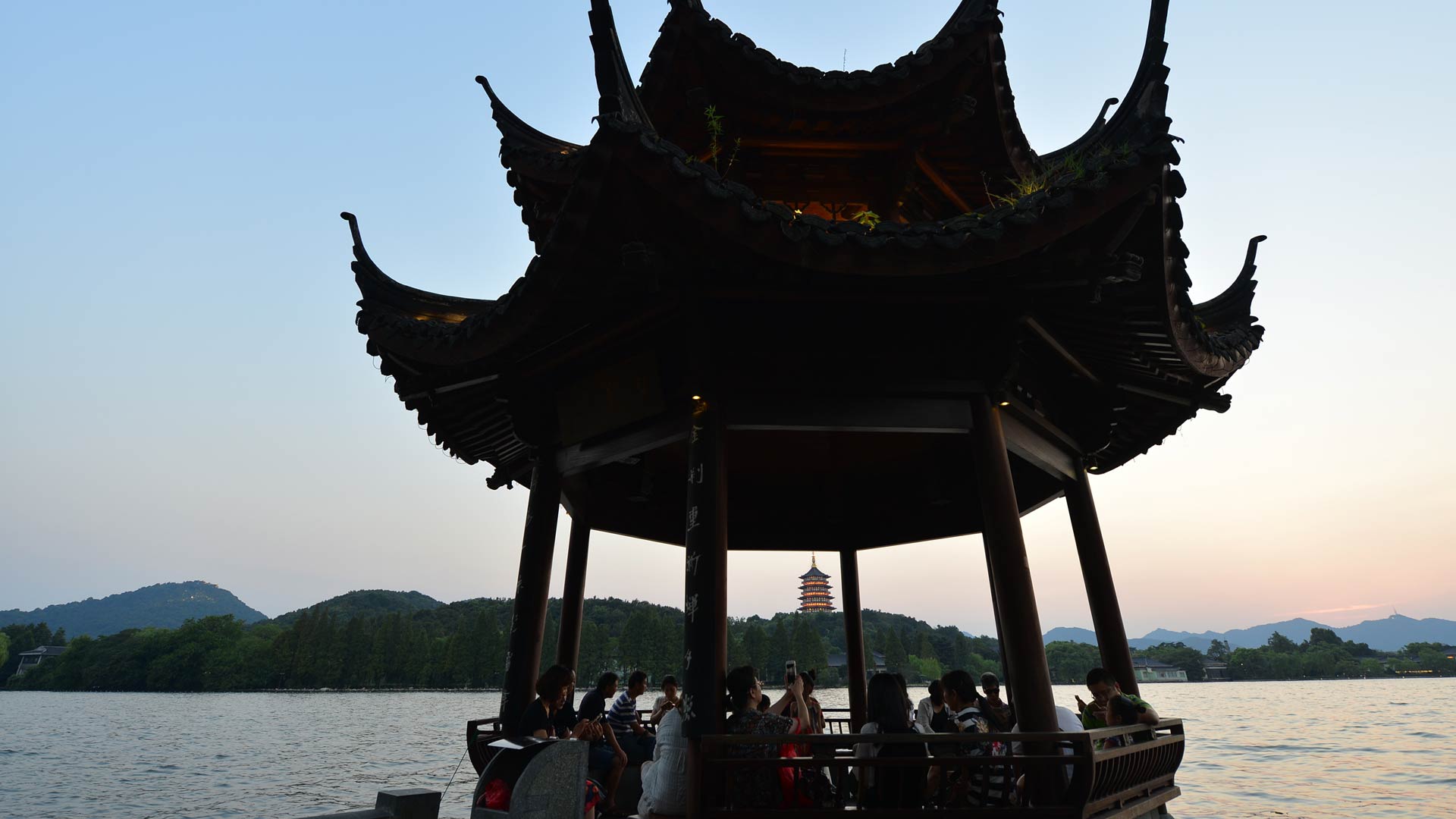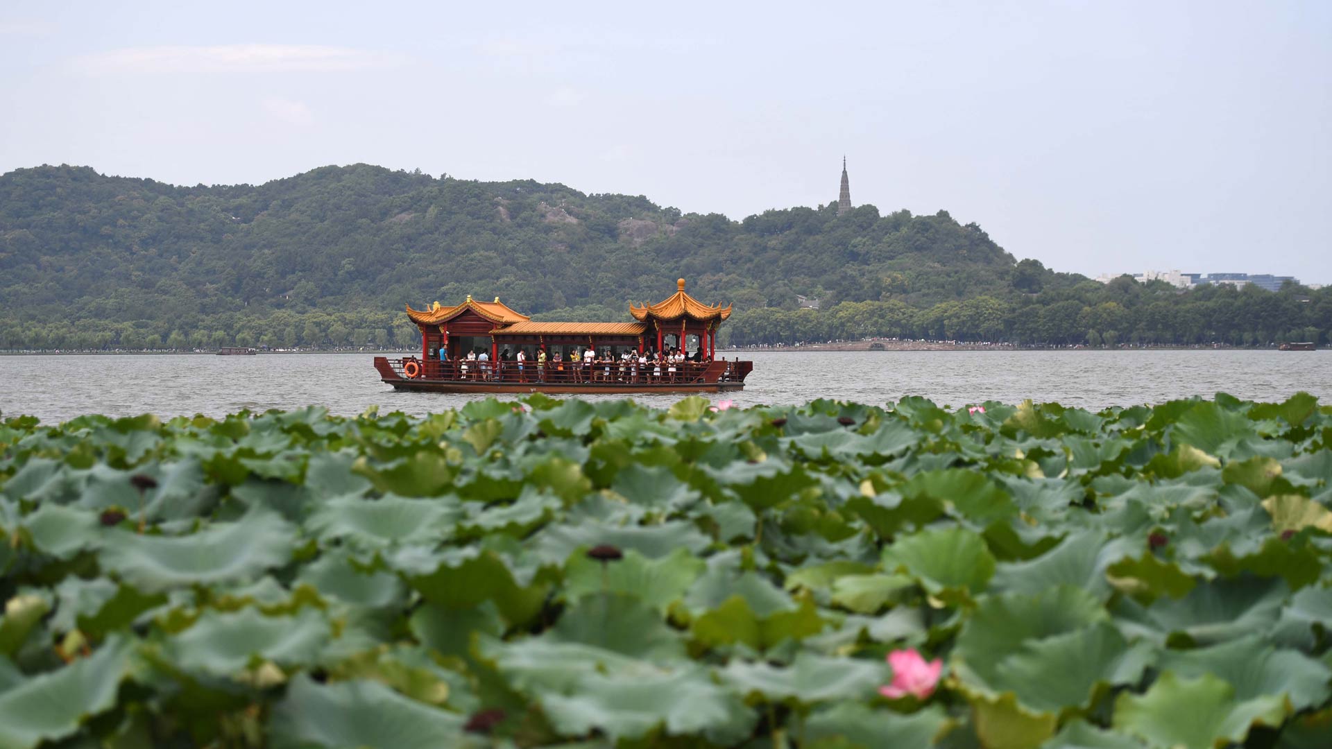 游客乘坐游船在西湖上游覽(8月27日攝)。 “三面云山一面城”,西湖的美麗自古就為眾多的作家和藝術(shù)家所稱頌?!拔骱啊北徽J(rèn)為是“天人合一”最理想最經(jīng)典的景觀體現(xiàn)。(新華社記者 陳曄華 攝)