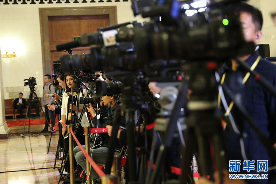 10月19日,“黨代表通道”第二場采訪活動在人民大會堂舉行。圖為現場媒體記者準備采訪。新華網 翟子赫 攝