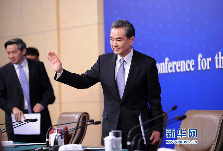 ????十二屆全國(guó)人大三次會(huì)議新聞中心于3月8日(星期日)10時(shí)在梅地亞中心多功能廳舉行記者會(huì),邀請(qǐng)外交部部長(zhǎng)王毅就中國(guó)的外交政策和對(duì)外關(guān)系相關(guān)問(wèn)題回答中外記者提問(wèn)。圖為外交部部長(zhǎng)王毅同記者揮手道別。新華網(wǎng)/中國(guó)政府網(wǎng) 翟子赫 攝