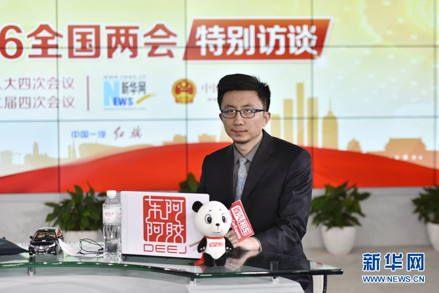 ????2016年3月13日,全國人大代表、海南省三沙市委書記、市政府市長肖杰做客新華網(wǎng)兩會訪談直播間。圖為主持人孫博。新華網(wǎng) 郭小天 攝