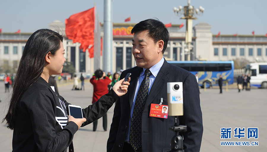?????3月14日,全國政協十二屆四次會議在北京人民大會堂舉行閉幕會。這是全國政協委員在人民大會堂外接受記者采訪。新華網/中國政府網??陳杰 攝
