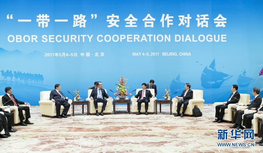5月4日,中國國家安全部與20多個國家安全部門“一帶一路”安全合作對話會在北京舉行。中共中央政治局委員、中央政法委書記孟建柱會見與會各國代表團團長。新華社記者 丁海濤 攝