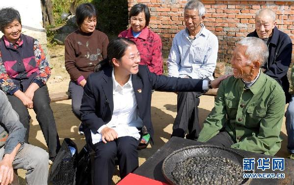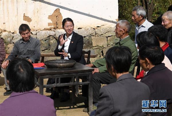 10月27日,十九大代表余靜(前左)在金寨縣大灣村與村民交流。新華社發(陳力攝)