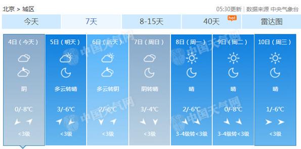 今天氣溫將處于冰點以下,明起稍有回升。北京市氣象臺預計,今晨上班時多云,北轉南風二三間四級,-5~-3℃;白天多云轉陰,北轉南風二三間四級,最高氣溫僅0℃,為本周最低點;夜間陰轉多云,西部山區有零星小雪,南轉北風一二級,最低氣溫-8℃,晝夜溫差達到8℃。明天開始至周日最高氣溫將回升到2~3℃,但到下周初又將再次回落至冰點。