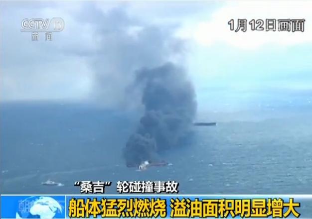 昨天(12日),央視記者登上國家海洋局海監(jiān)飛機(jī),在空中勘察“桑吉”輪碰撞事故現(xiàn)場。記者發(fā)現(xiàn),桑吉輪船身猛烈燃燒,溢油情況比前兩天明顯增多,火勢已經(jīng)蔓延到海面,桑吉輪船體傾斜嚴(yán)重,非常脆弱。
