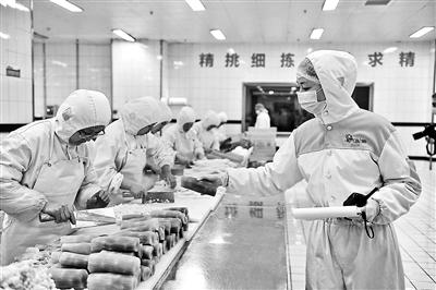 昨天,北京青年報記者走進北京京鐵列車服務有限公司餐食生產基地探訪。從早上8點開始,各種種類的盒飯就開始進行生產制作了。進貨檢驗、毛菜處理、精加工、炒制、快速降溫、稱重包裝、金屬異物檢測、抽檢留樣……一盒高鐵盒飯的生產出爐要經過大大小小十幾道工序,食品安全總被放在第一位。