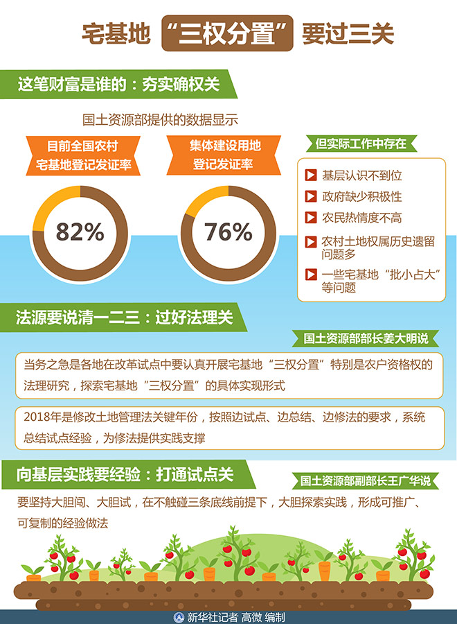 “交換的前提是產權清晰。‘三權分置’必須建立在權屬清晰的基礎上。否則,既有問題將更加復雜,新的麻煩也會不斷產生。”國家行政學院教授劉銳說,“三權分置”要做好確權這項基礎性工作。宅基地確權需要準確把握法律法規和政策規定,不能“一刀切”,不能讓違法違規者通過“三權分置”獲取超額利益。要處理好違法違規宅基地占有者、合法宅基地權利人以及因各種客觀原因沒有取得宅基地的農民之間的利益平衡。