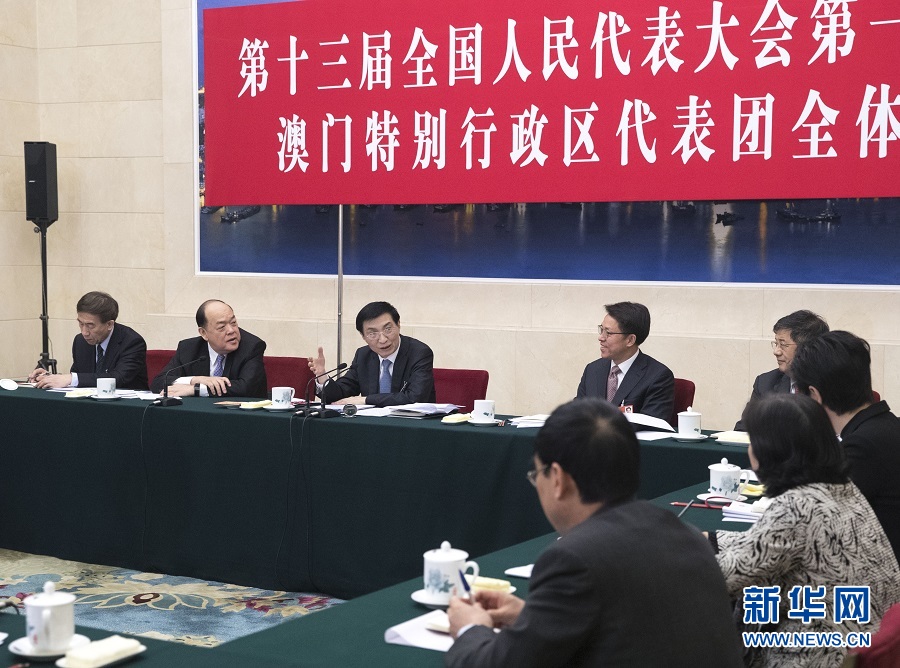 3月6日,中共中央政治局常委、中央書(shū)記處書(shū)記王滬寧參加十三屆全國(guó)人大一次會(huì)議澳門代表團(tuán)的審議。 新華社記者王曄攝