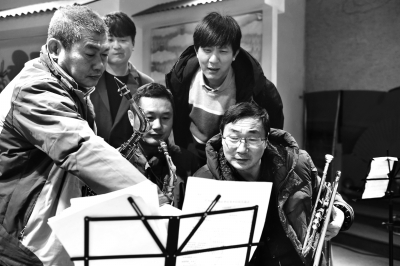 在馬莊村文化禮堂,農民樂團的成員在排練時討論樂譜。新華社發(fā)