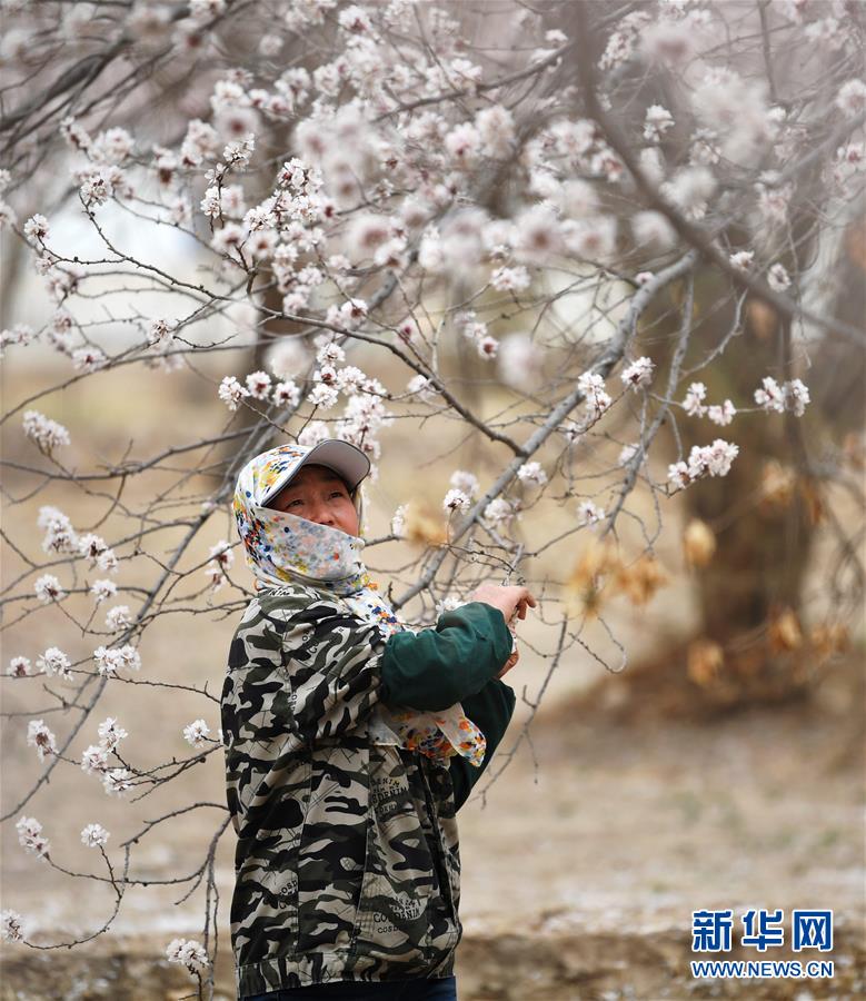 3月28日,農(nóng)民在敦煌鳴沙山下的李廣杏園內(nèi)勞作。近日,甘肅省敦煌市鳴沙山下8000多畝李廣杏花競(jìng)相開(kāi)放,吸引了眾多游客和市民踏青賞花。 新華社記者陳斌攝