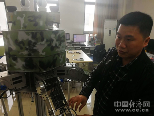 蔣剛介紹“龍騎士”機(jī)器人。經(jīng)濟(jì)日報-中國經(jīng)濟(jì)網(wǎng)記者 佟明彪/攝