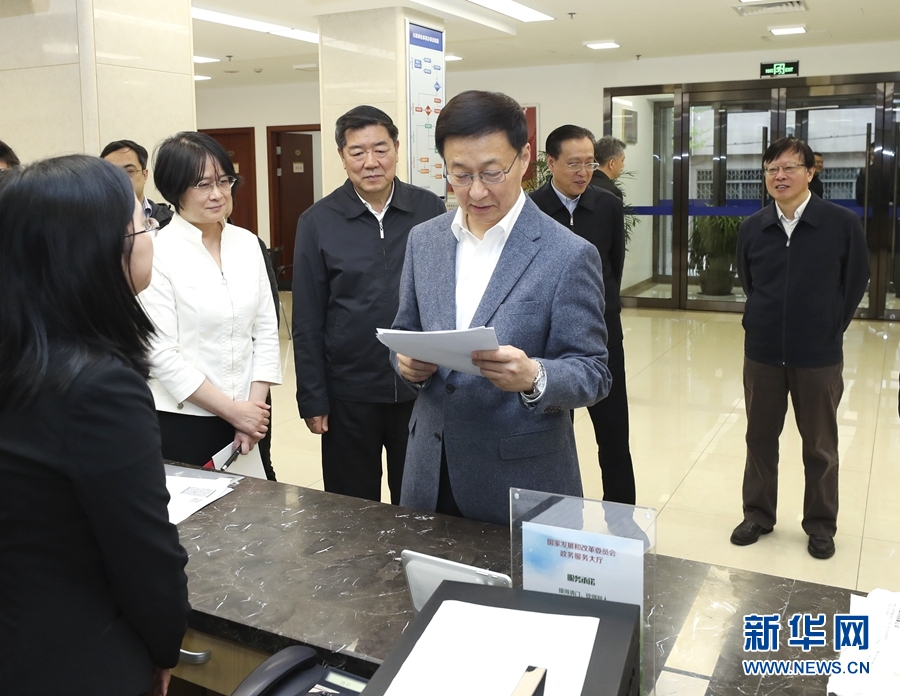 4月3日,中共中央政治局常委、國務院副總理韓正到國家發(fā)展改革委調研并主持召開座談會。這是韓正在國家發(fā)展改革委政務服務大廳考察。新華社記者 龐興雷 攝