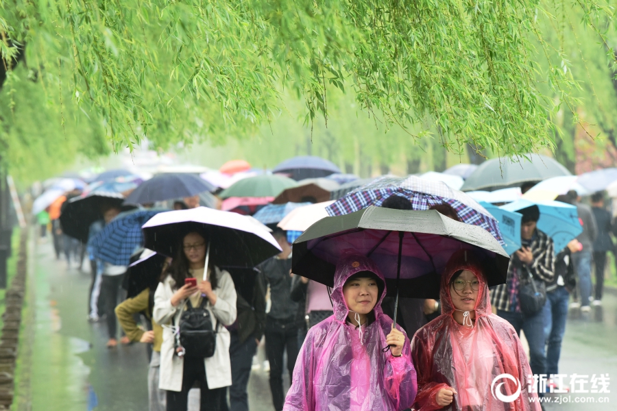 4月5日,清明小長假首日,杭州細雨綿綿,西湖景區游客絡繹不絕。杭城雖降雨降溫,但西湖景區前來賞花踏青的游客如潮,斷橋似人橋。(浙江在線拍友 里爾 柱子 攝)