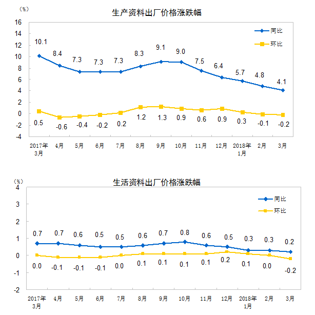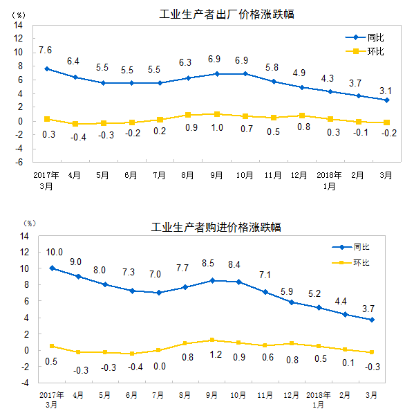 2018年3月份,全國工業生產者出廠價格同比上漲3.1%,環比下降0.2%。工業生產者購進價格同比上漲3.7%,環比下降0.3%。一季度,工業生產者出廠價格同比上漲3.7%,工業生產者購進價格同比上漲4.4%。