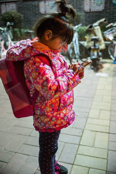 1月19日,在濟(jì)南實(shí)驗(yàn)初中校門外,一位和姑姑來(lái)等表姐放學(xué)的小女孩,背著幼兒園的小書包,站在那里低頭聚精會(huì)神地玩著姑姑的手機(jī)。