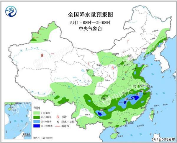 中央氣象臺預計,5月1日至3日,我國中東部自西向東將有一次較大范圍降水天氣過程,其中,東北地區東南部、黃淮東部、西南地區東部和南部、江漢南部、江南大部、華南中西部等地的部分地區有中到大雨,局地暴雨或大暴雨,上述局部地區將伴有短時強降水、雷暴大風等強對流天氣。