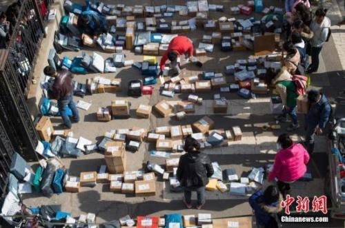 資料圖:快遞工作人員忙著分揀滿地的快遞。武俊杰 攝