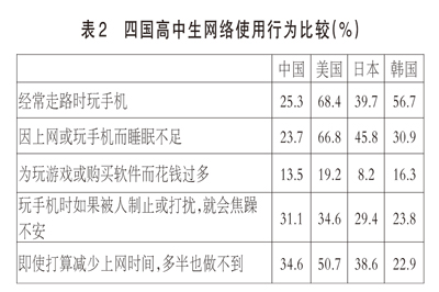 如果中學(xué)生的在線活動(dòng)影響了現(xiàn)實(shí)生活,并引發(fā)沖突,就需要給予引導(dǎo)。由表2的數(shù)據(jù)可見,25.3%的中國高中生經(jīng)常走路時(shí)玩手機(jī),低于其他三國,美國、韓國和日本依次為68.4%、56.7%和39.7%;23.7%的中國高中生因上網(wǎng)或玩手機(jī)而睡眠不足,低于其他三國,美國、日本和韓國依次為66.8%、45.8%和30.9%;13.5%的中國高中生因玩游戲或購買軟件而花錢過多,在四國中居第三,美國和韓國依次為19.2%和16.3%,分別比中國高5.7和2.8個(gè)百分點(diǎn),日本為8.2%,比中國低5.3個(gè)百分點(diǎn)??梢?,美國高中生網(wǎng)絡(luò)行為影響現(xiàn)實(shí)生活的最多,而中國高中生比較理性。