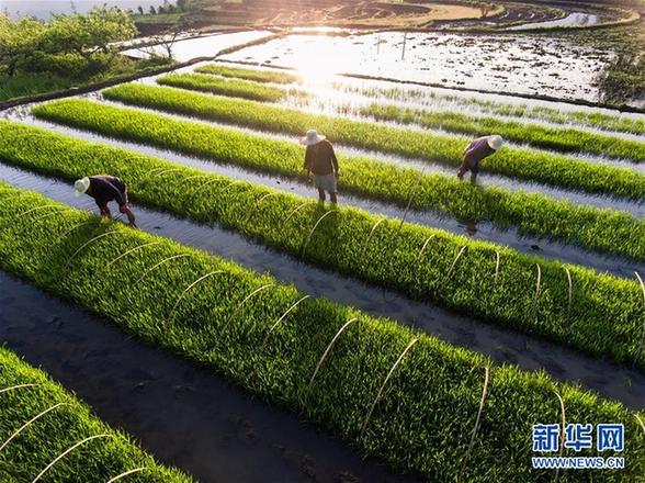 5月21日,在貴州省大方縣對江鎮金星村,村民在秧田里進行苗床管理。新華社發(羅大富 攝)
