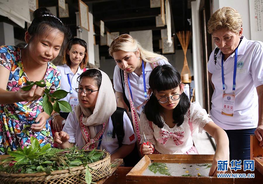 2017年8月15日,“魅力非遺——第二屆上海合作組織夏令營(yíng)·非物質(zhì)文化遺產(chǎn)交流體驗(yàn)”活動(dòng)在貴州省黔東南苗族侗族自治州丹寨縣萬(wàn)達(dá)小鎮(zhèn)舉行。這是外國(guó)手工藝人在古法造紙?bào)w驗(yàn)館了解花草紙的制作過(guò)程。新華社發(fā)(黃曉海 攝)