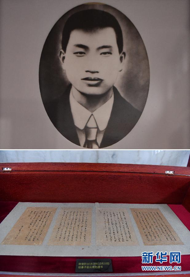 拼版照片:上圖為陳覺像;下圖為湖南省長(zhǎng)沙市烈士公園展出的陳覺烈士寫給妻子趙云霄的遺書(5月7日攝)。新華社發(fā)