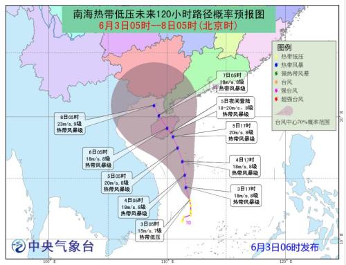 預計,低壓中心將以每小時10公里左右的速度向偏北方向移動,強度逐漸加強,將于3日白天到夜間發展為今年第4號臺風(熱帶風暴級),并逐漸向海南島東部一帶沿??拷?。
