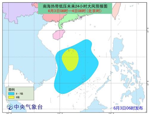 中央氣象臺3日06時繼續發布熱帶低壓預報:南海熱帶低壓的中心今天5點鐘位于我國西沙永興島偏南方大約410公里的南海南部海面上(北緯13.2度、東經111.9度),中心附近最大風力有7級(15米/秒),中心最低氣壓為1002百帕。