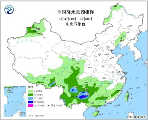 6月3日08時至4日08時,新疆中北部、青藏高原中東部、甘肅南部、西南地區大部、江南中南部、華南大部等地有小到中雨,西南地區東部和南部、華南北部和中部等地的局地有大雨或暴雨(100~120毫米),上述局部地區將伴有短時強降水等強對流天氣。新疆北部、內蒙古東部、華北西部等地的部分地區有4~6級風,其中北疆山口地區陣風可達9~10級。南海中南部等地將有6-8級大風,陣風9級。