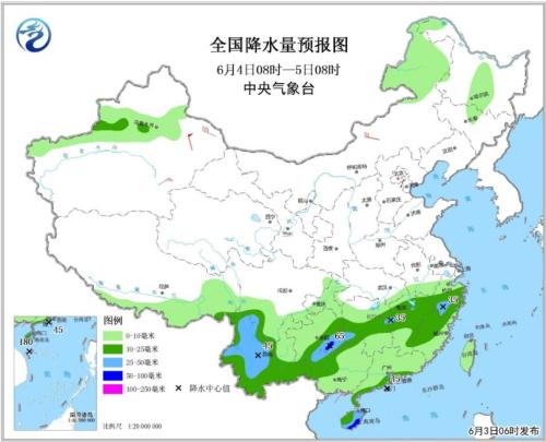 全國降水量預報圖(6月3日08時-4日08時)