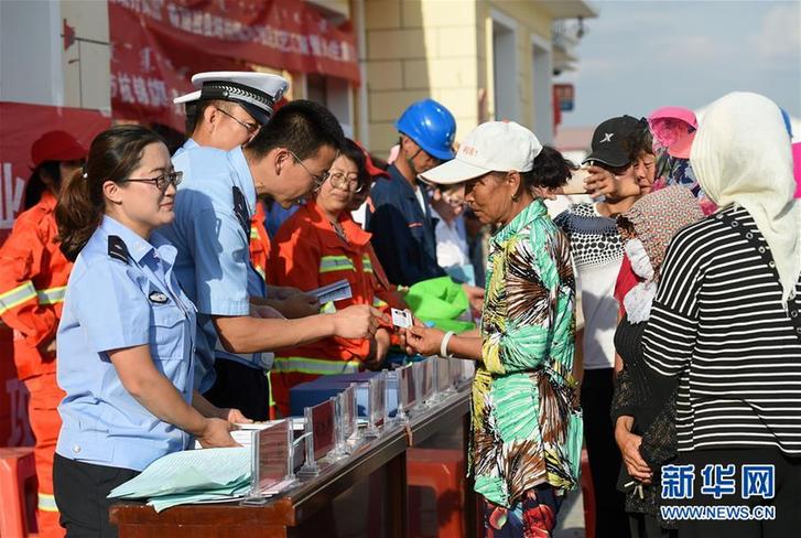 在內蒙古鄂爾多斯市杭錦旗獨貴塔拉鎮芒哈圖村,獨貴塔拉鎮派出所民警在“民生集市”上向群眾發放新辦理的身份證(6月8日攝)。新華社記者 彭源 攝