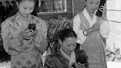 1993年8月14日西藏拉薩正式開通“大哥大”成了新聞頭條(新華社記者 范長國攝),而2018年5月2日,在珠穆朗瑪峰旅游大本營一家帳篷旅館內,游客用手機上網已是司空見慣(新華社記者 黃浩銘 攝)。