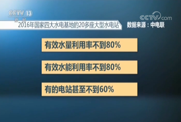 中電聯給出的數字,四川省調峰棄水電量由2013年的76億度,增加至2016年的140億度;云南省2014至2016年裝機棄水電量分別達到173億、153億和314億度。2016年國家四大水電基地的20多座大型水電站有效水量利用率、有效水能利用率不到80%,有的電站甚至不到60% 。