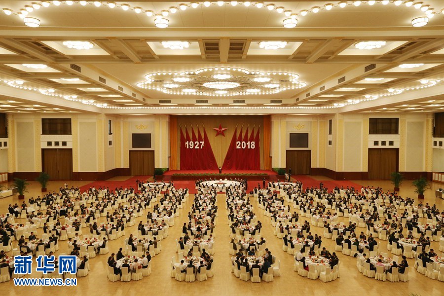人民大會堂燈火輝煌、鮮花綻放,中外嘉賓歡聚一堂、共慶節日。主席臺帷幕中央懸掛著巨型“八一”軍徽,十面鮮艷的紅旗分立兩側。“1927-2018”醒目的大字熠熠生輝,昭示著中國人民解放軍走過了91年的光輝歲月,走進新時代,踏上新征程。