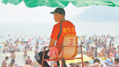 8月5日,一名救生員在江蘇省連云港市連島海水浴場(chǎng)移動(dòng)瞭望塔上值守。王健民攝(人民視覺)